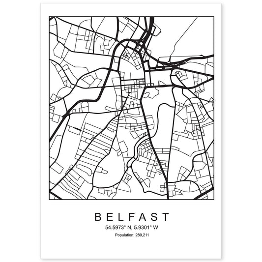 Lámina de mapa estilo nórdico de Belfast en blanco y negro