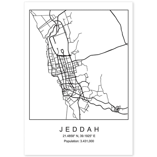 Lámina de mapa estilo nórdico de Jeddah en blanco y negro