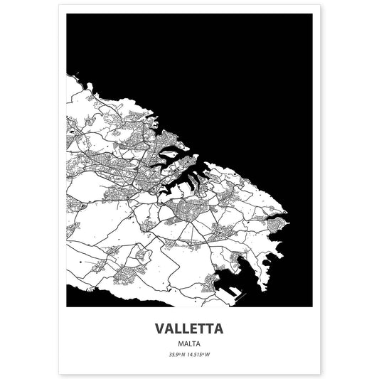Lámina de mapa de Valletta - Malta en color negro