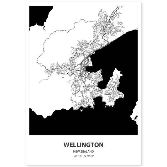 Lámina de Mapa de Wellington, Nueva Zelanda en Negro