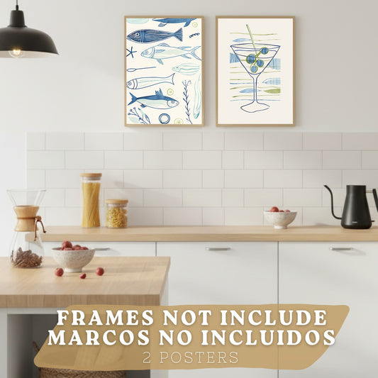 Set de 2 Láminas Cocina Minimalista Cuadros Pared Peces y Martini Estilo Acuarela Line Art Póster Decoración Comedor