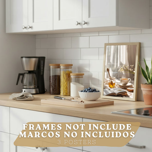 Set de 3 Láminas Café y Desayuno Acogedor Cuadros Cocina Croissant Miel y Té Estilo Nórdico Póster Decoración Pared