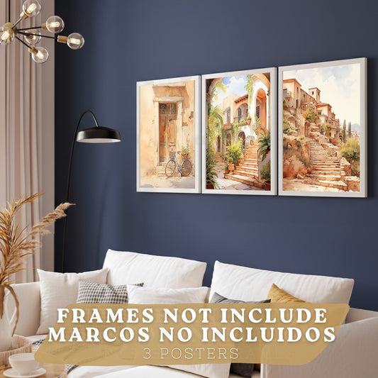 Juego de 3 laminas decorativas pared estilo rural. Cuadros Salon modernos Posters decorativos tonos marrones. Acuarelas vintage.