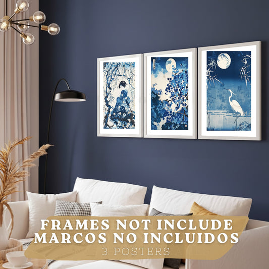 Set de 3 laminas decorativas pared estilo Japon. Cuadros Salon modernos - Posters decorativos azules orientales. Arte japones. Decoración Dormitorios.