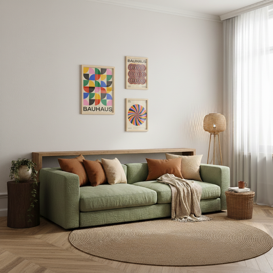 Set de 6 pósters Bauhaus con formas geométricas coloridas estilo moderno abstracto – ideal para salón, despacho, dormitorio o espacios creativos – círculos, ojos, líneas y bloques en rosa, rojo, azul, verde, amarillo, naranja