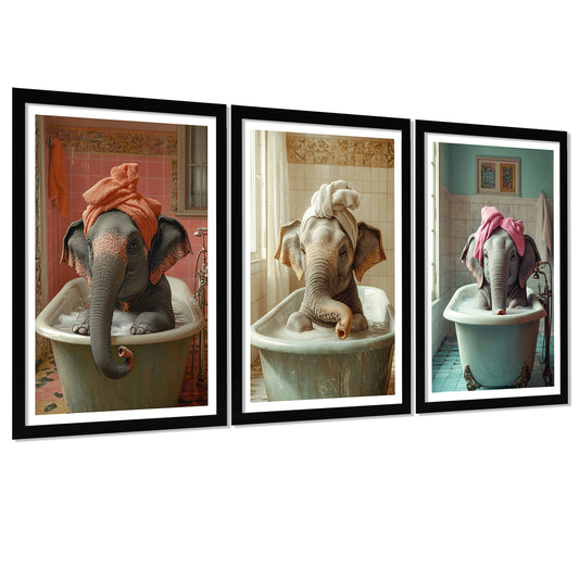 Set de 3 Cuadros de Bebé Elefante Bañandose con Lindos Animales Coloridos, Ilustración para Decorar, Wallart para Inodoro, Ducha, Baño, Aseo, WC