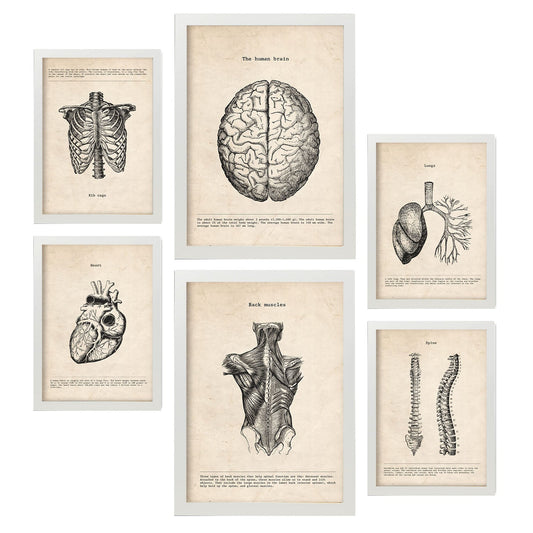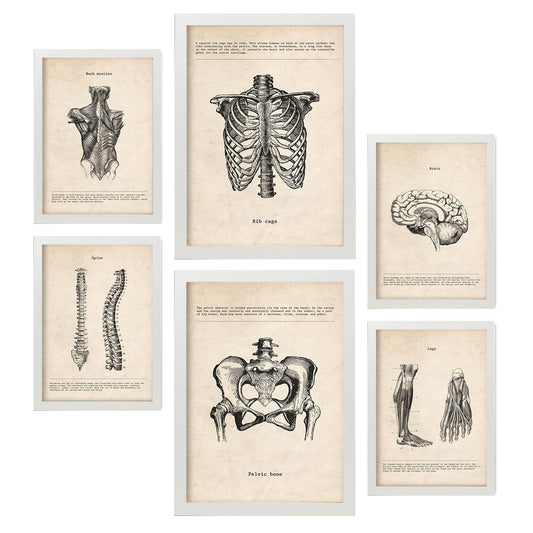 Set de 6 pósters vintage anatómicos con ilustraciones del cerebro, esqueleto, músculos y extremidades humanas – estilo médico clásico para consulta, estudio o despacho – blanco y negro, ciencia, cuerpo humano