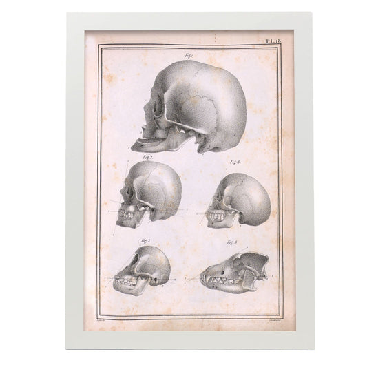 Lámina de Cráneos Paillou: Adulto Geriátrico, Caucasico, Negroid, Orangután y Perro