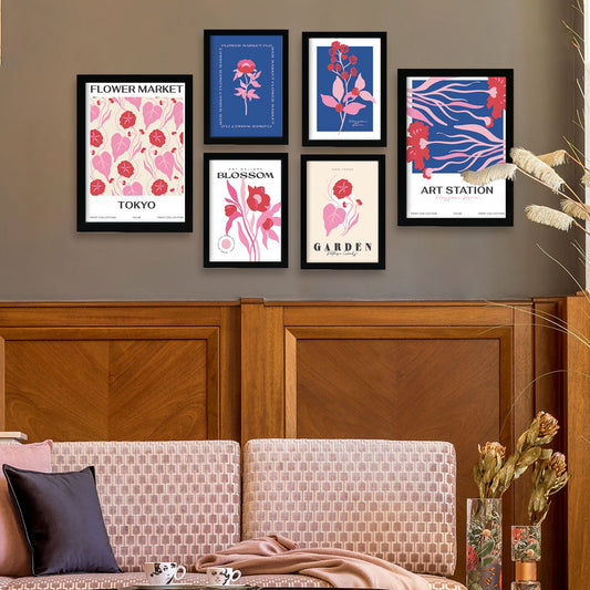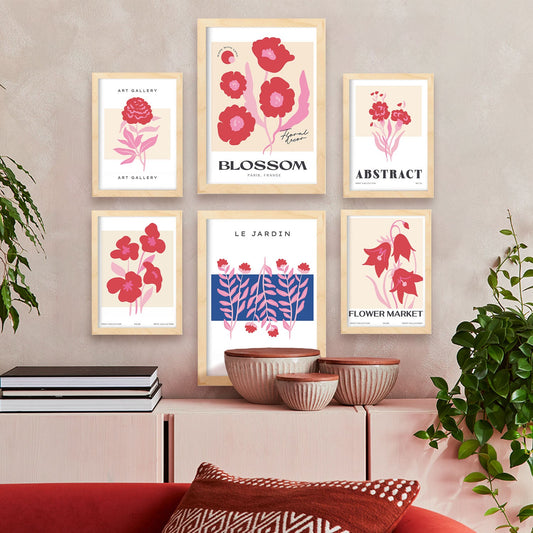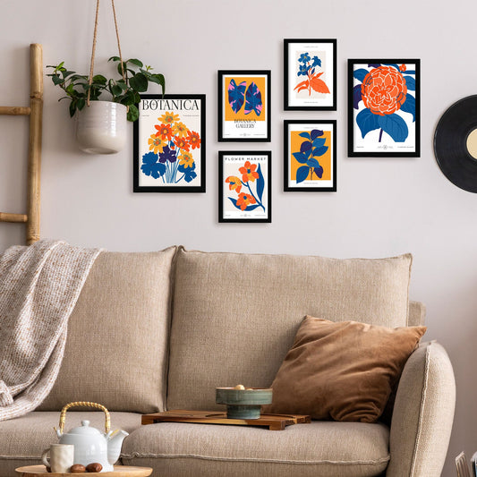 Set de 6 láminas florales con ilustraciones modernas y colores vivos de flores exóticas para salón, dormitorio o estudio contemporáneo – 2 grandes y 4 medianos