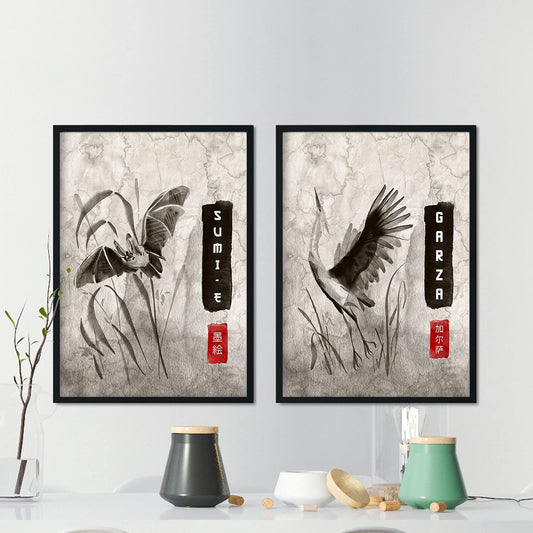 Set de láminas Sumi-E de animales voladores vintage en grises