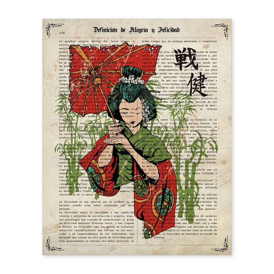 Lámina de Geisha con Sombrilla y Diseños Japoneses