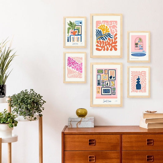 Set de 6 láminas minimalistas en colores pastel con plantas, flores y rincones de hogar para decorar salón, dormitorio o estudio moderno – 2 grandes y 4 medianos