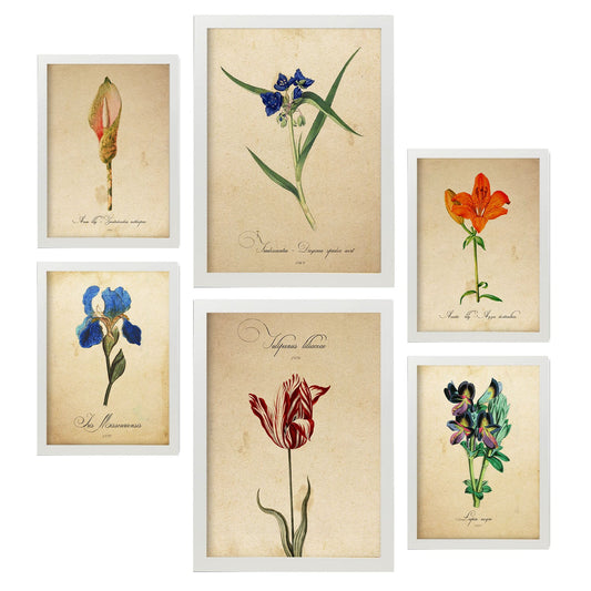 Set de 6 láminas botánicas estilo vintage con flores ilustradas en tonos azules, rojos y naranjas sobre fondo envejecido para salón, dormitorio o pasillo, 2 grandes y 4 medianos