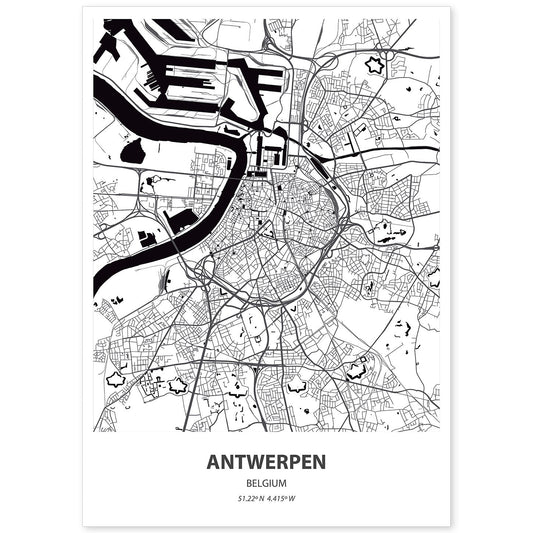 Lámina de mapa de Antwerpen, Bélgica en color negro
