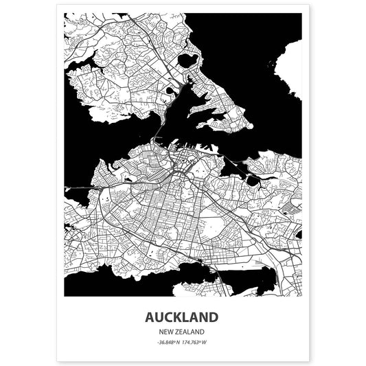 Lámina de mapa de Auckland, Nueva Zelanda en color negro