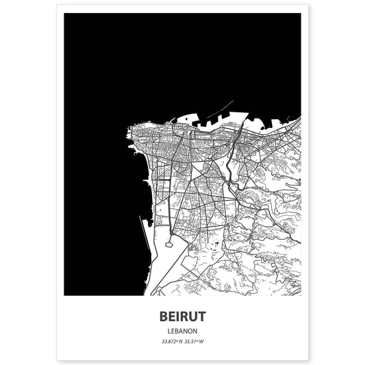 Lámina de Mapa de Beirut, Libano en Color Negro