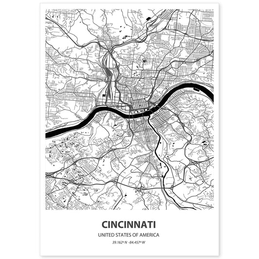 Lámina de Mapa de Cincinnati, USA en Color Negro