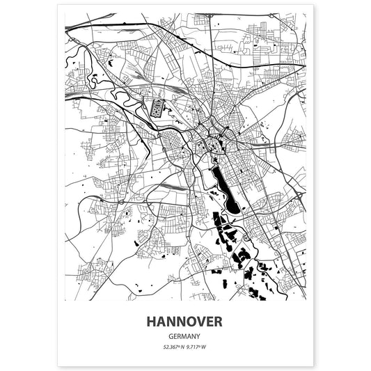 Lámina de Mapa de Hannover, Alemania en Color Negro