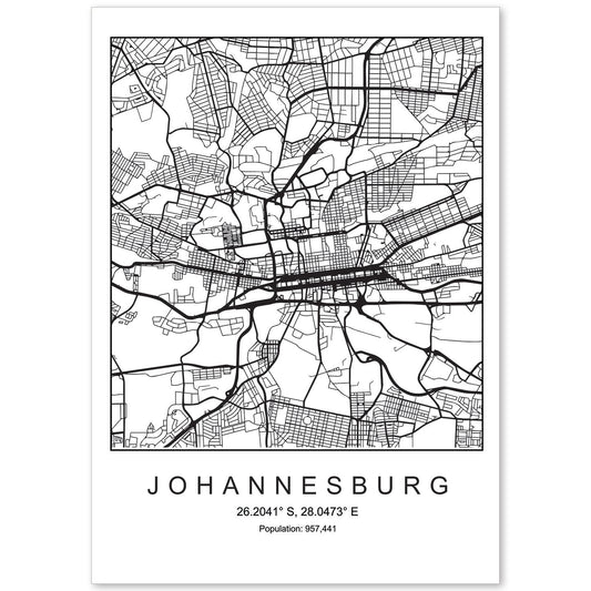 Lámina estilo nórdico del mapa de Johannesburgo en blanco y negro