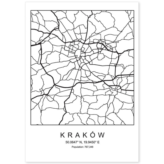 Lámina estilo nórdico del mapa de Kaków en blanco y negro