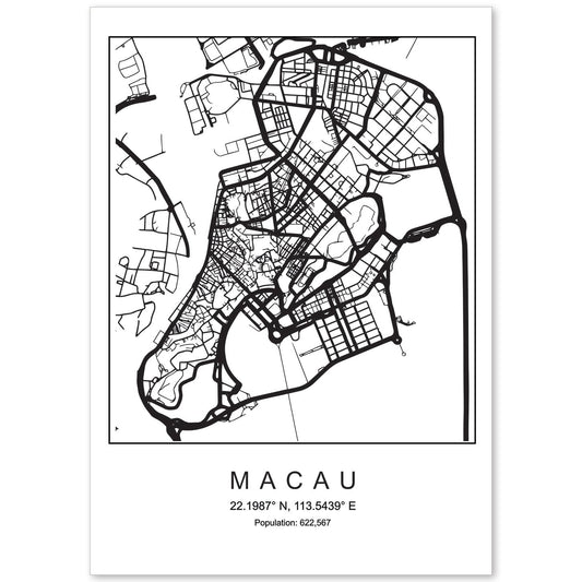 Lámina estilo nórdico del mapa de Macau en blanco y negro