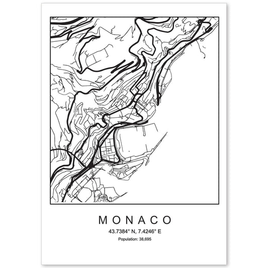 Lámina estilo nórdico del mapa de Monaco en blanco y negro
