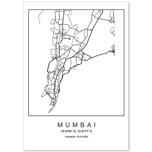 Lámina estilo nórdico del mapa de Mumbai en blanco y negro