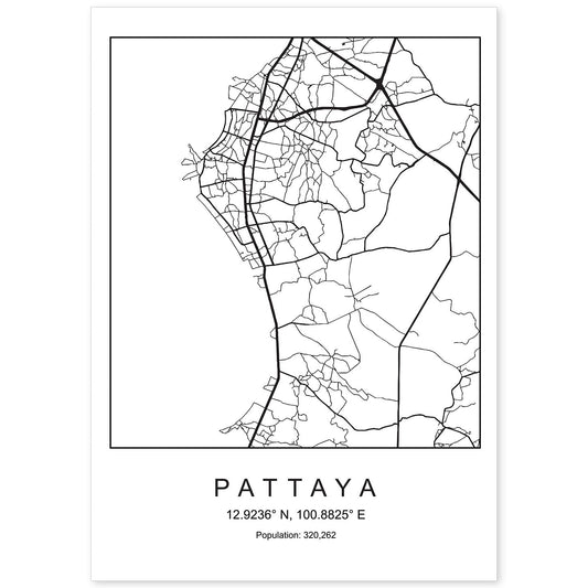 Lámina estilo nórdico del mapa de Pattaya en blanco y negro