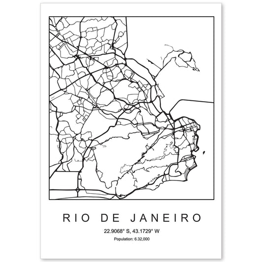 Lámina estilo nórdico del mapa de Rio de Janeiro en blanco y negro