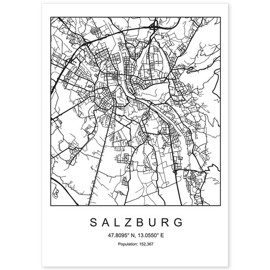 Lámina estilo nórdico del mapa de Salzburg en blanco y negro