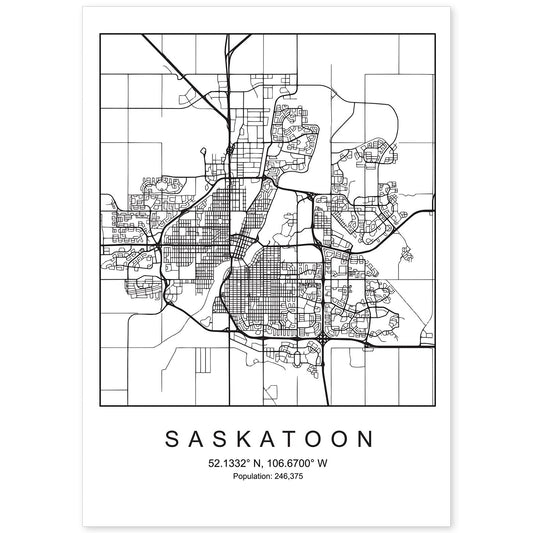 Lámina estilo nórdico del mapa de Saskatoon en blanco y negro