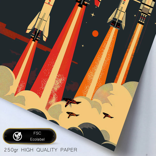 Nave espacial, cohete, planetas vintage tonos rojos y azules