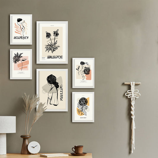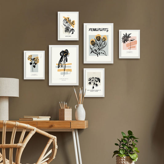 Set de 6 pósters Flower Power en colores pastel. Láminas minimalistas de flores y hojas con estilo moderno para decorar hogar, oficina o estudio. Tamaños A3 y A4.