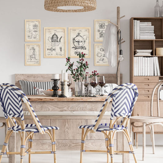 Set de 6 láminas estilo vintage con patentes antiguas de cafeteras e inventos relacionados en fondo envejecido para cocina, comedor o cafetería, 2 grandes y 4 medianos