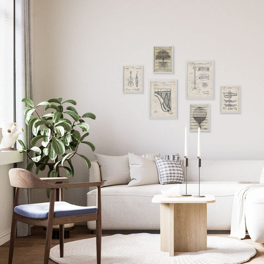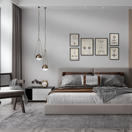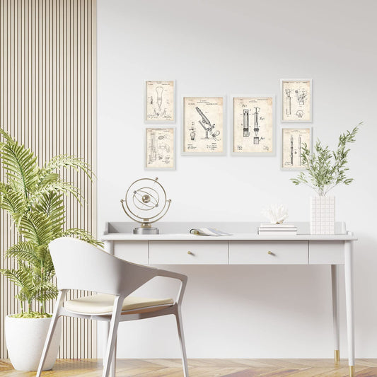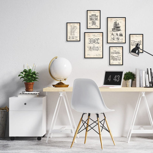Set de 6 láminas estilo vintage con patentes originales de Nikola Tesla en tonos sepia para oficina, estudio o decoración industrial, 2 grandes y 4 medianos