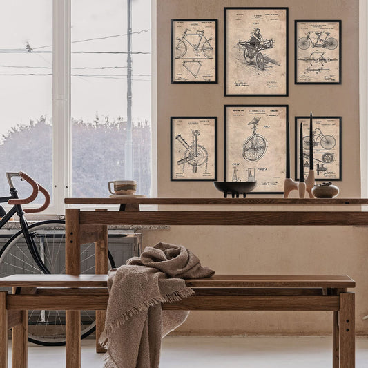 Set de 6 láminas vintage con patentes de bicicleta, monociclo y mecanismos antiguos para decorar hogar, oficina o taller con estilo retro – 2 grandes y 4 medianos