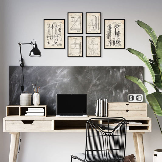 Set de 6 láminas vintage con patentes de herramientas de medición como compás, regla y transportador para oficina, estudio o taller técnico – 2 grandes y 4 medianos