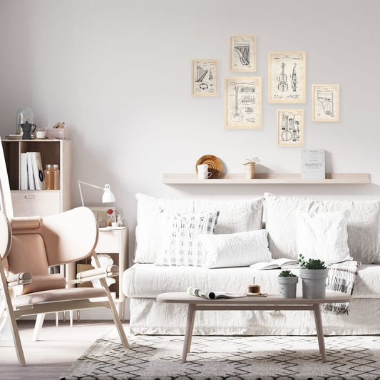 Set de 6 láminas vintage con ilustraciones de patentes de instrumentos de cuerda como guitarra, violín y arpa para estudio, salón o música – 2 grandes y 4 medianos