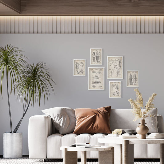 Set de 6 láminas vintage con patentes de surf, trajes, tablas y accesorios náuticos para decorar oficina, tienda o espacio deportivo – 2 grandes y 4 medianos