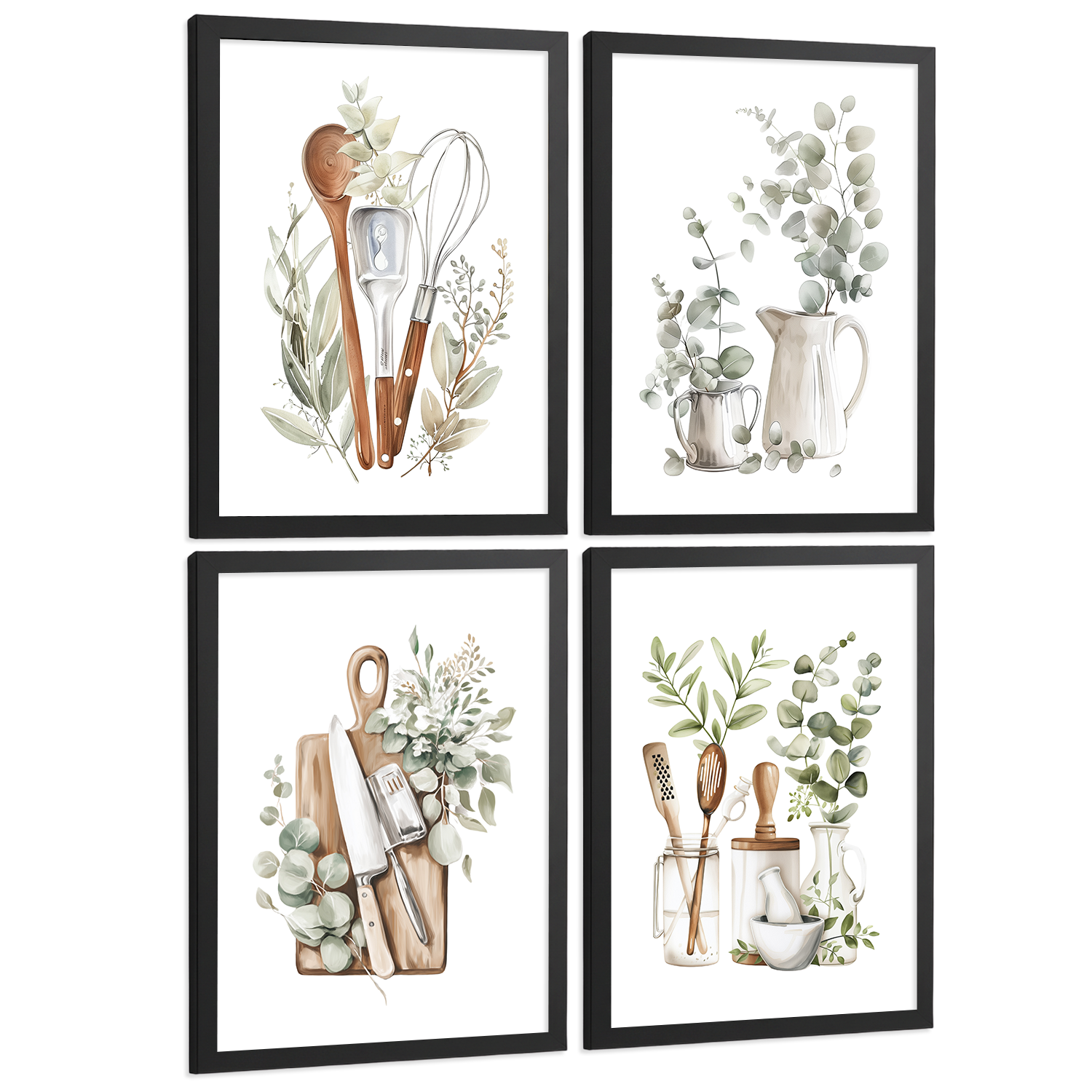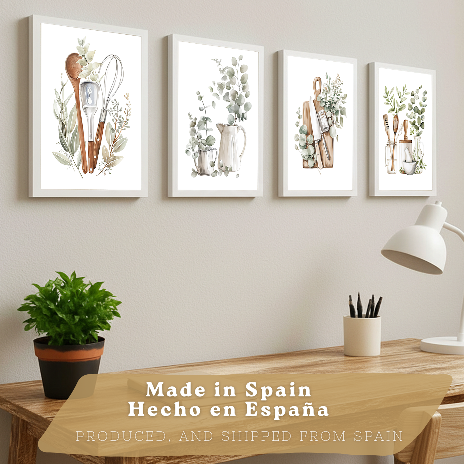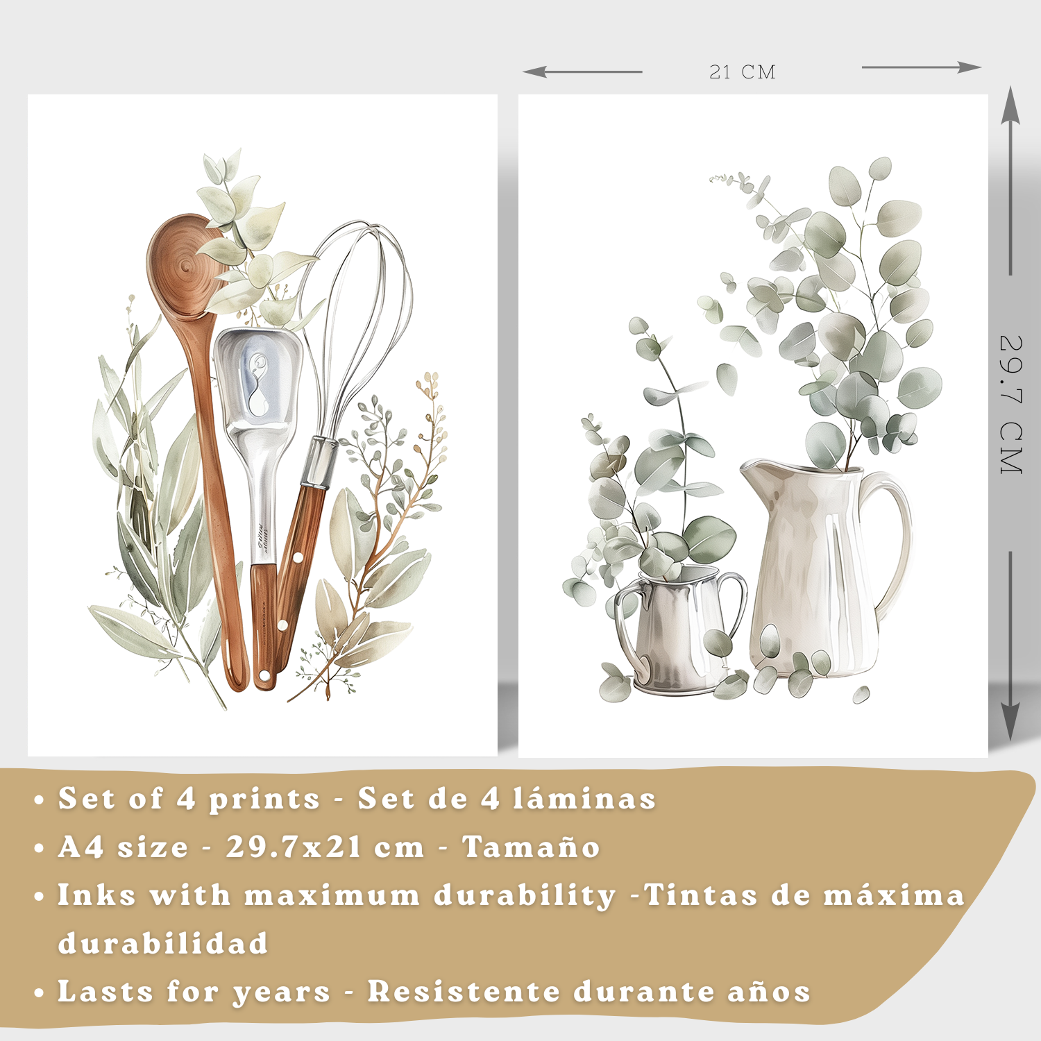 Nacnic Juego De 4 Lámnas Decorativas Pared Cocina Botanica.Estilo Rural Bohemico. Cocina Rustica. Plantas Y Cubiertos, Laminas Decorativas Pared Para Salón Y Dormitorio