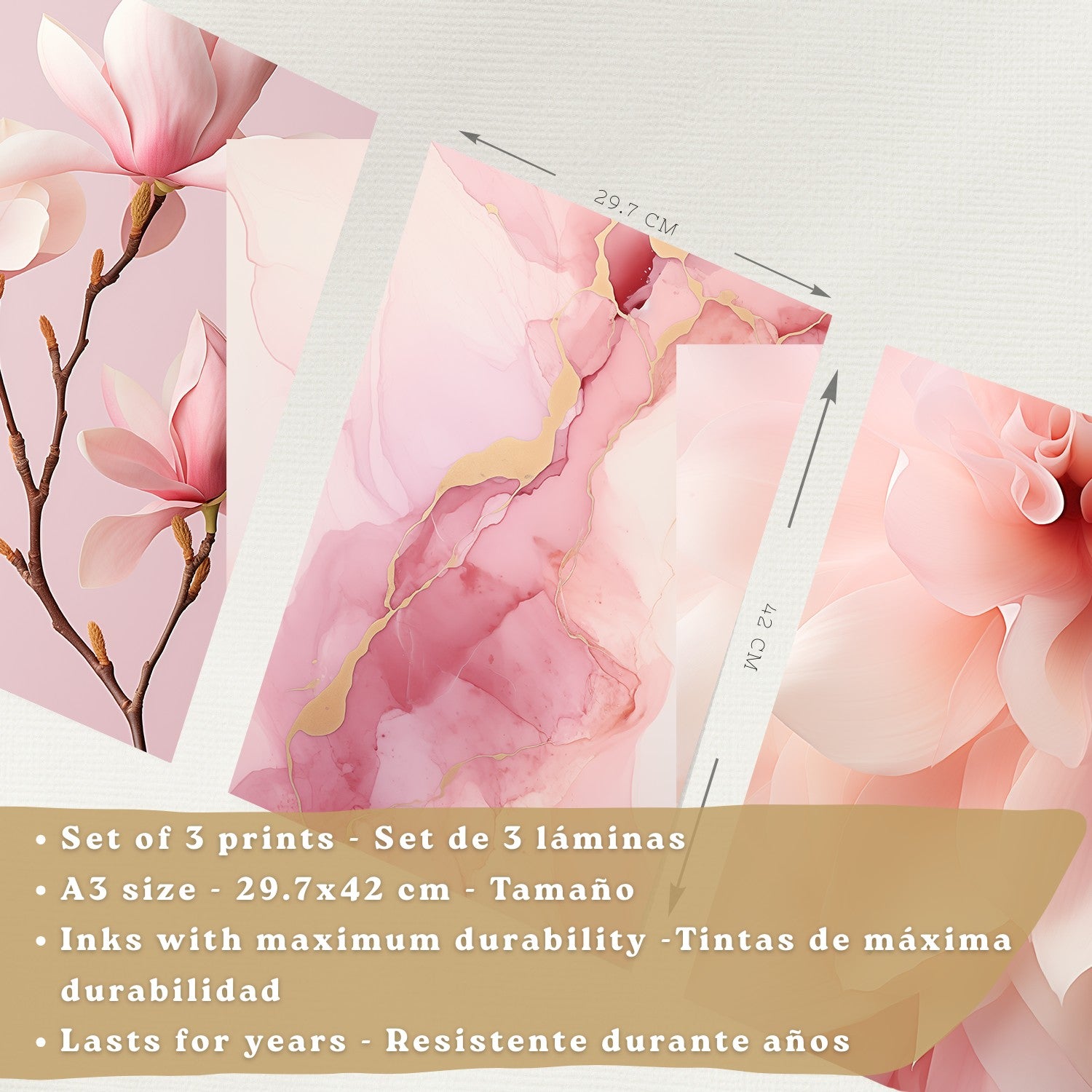 Set de 3 laminas decorativas pared flores rosas botanico Cuadros Salon modernos Orquidea marmol Posters decorativos rosas Decoración Dormitorios Sala de estar