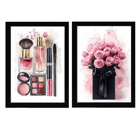 Set de 2 Cuadros de Maquillaje y Cosmética con Flores Rosas, Ilustración impresa para decorar las paredes del WC, Tocador, Baño, Vestidor, Salón