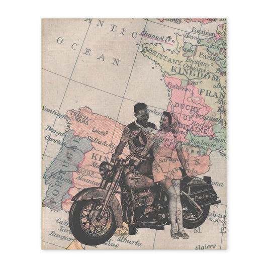 Lámina de Pareja en Moto en Mapa de España Vintage