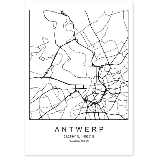 Lámina estilo nórdico de mapa de Antwerp en blanco y negro