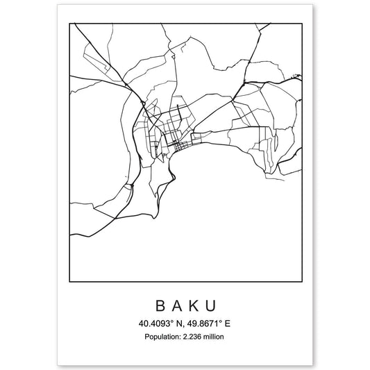 Lámina estilo nórdico de mapa de Baku en blanco y negro