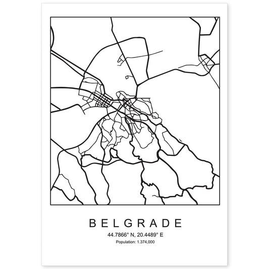 Lámina estilo nórdico de mapa de Belgrade en blanco y negro