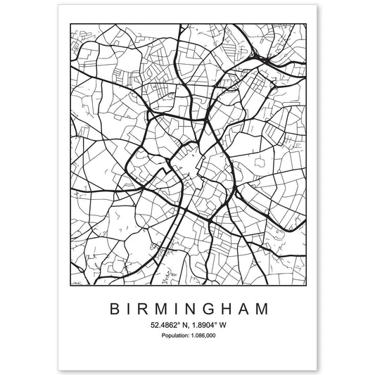 Lámina estilo nórdico de mapa de Birmingham en blanco y negro