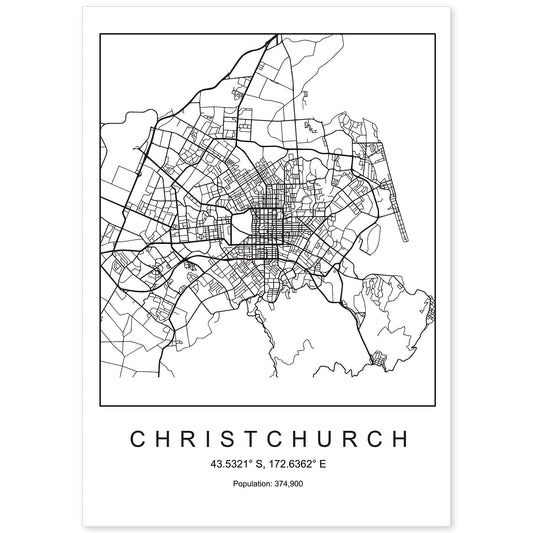 Lámina estilo nórdico de mapa Christchurch en blanco y negro