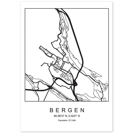 • Lámina mapa de la ciudad Bergen estilo nordico en blanco y negro.-Artwork-Nacnic-Nacnic Estudio SL