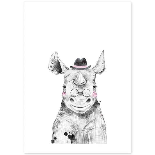 • Lámina Rinoceronte infantil con gafas y sombrero poster animales infantiles-Artwork-Nacnic-Nacnic Estudio SL